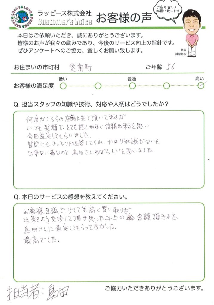 何度かこちらの店舗に来て頂いていますが、いつも笑顔でとても話しやすく、信頼できると思い今回査定してもらいました。
