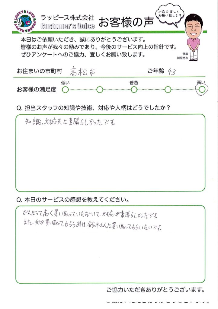 高浜市 43歳|知識、対応共に素晴らしかったです 2024 8/30 お客様の満足度 ★★★★★ 担当スタッフについて 知識、対応共に素晴らしかったです。 買取りについて がんばって高く買い取っていただいて、対応が素晴らしかったです。 また、何か買い取ってもらう時は、鈴木さんに買い取ってもらいたいです。 買取り よかったらシェアしてね! URLをコピーしました! URLをコピーしました! 関連記事 高浜市 48歳|めちゃめちゃいい!すごくお得感があった 大分市 74歳|お客様の気持ちになってくれた 高松市 50歳|出会えたことに感謝します 高浜市 77歳|息子の様に接してくれた 高浜市 51歳|色んな商品のご相談にのってくださり助かりました 高浜市 77歳|最高 がんばりや!! 愛媛県愛南町(56歳) お客様目線で思った以上の金額を頂きました 熊本県宇城市(45歳) 対応が良く仕事も早く完璧