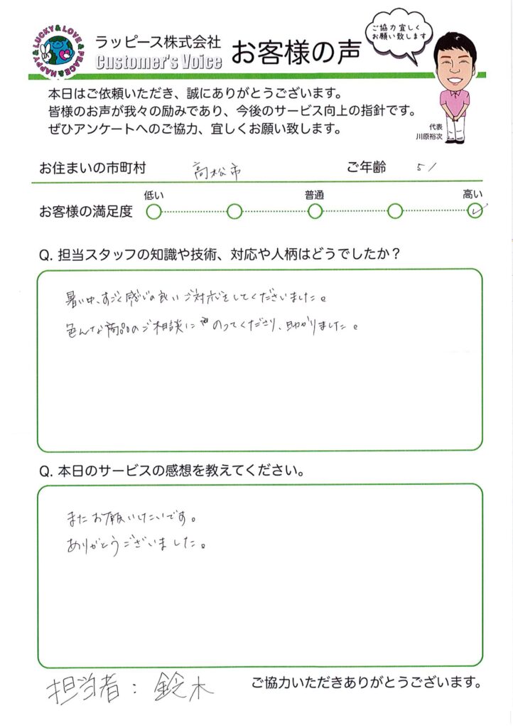 高浜市 51歳|色んな商品のご相談にのってくださり助かりました 2024 8/30 お客様の満足度 ★★★★★ 担当スタッフについて 暑い中すごく感じが良い対応をしてくださいました。 色んな商品のご相談にのってくださり、助かりました。 買取りについて またお願いしたいです。 ありがとうございました。 買取り よかったらシェアしてね! URLをコピーしました! URLをコピーしました! 関連記事 高浜市 48歳|めちゃめちゃいい!すごくお得感があった 大分市 74歳|お客様の気持ちになってくれた 高松市 50歳|出会えたことに感謝します 高浜市 77歳|息子の様に接してくれた 高浜市 77歳|最高 がんばりや!! 高浜市 43歳|知識、対応共に素晴らしかったです 愛媛県愛南町(56歳) お客様目線で思った以上の金額を頂きました 熊本県宇城市(45歳) 対応が良く仕事も早く完璧