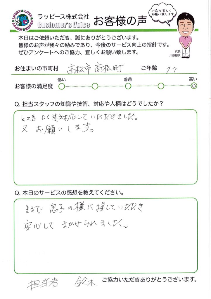 高浜市 77歳|息子の様に接してくれた 2024 8/30 お客様の満足度 ★★★★★ 担当スタッフについて とてもよく対応していただきました。 又お願いします。 買取りについて まるで息子の様に接していただき安心してまかせられました。 買取り よかったらシェアしてね! URLをコピーしました! URLをコピーしました! 関連記事 高浜市 48歳|めちゃめちゃいい!すごくお得感があった 大分市 74歳|お客様の気持ちになってくれた 高松市 50歳|出会えたことに感謝します 高浜市 51歳|色んな商品のご相談にのってくださり助かりました 高浜市 77歳|最高 がんばりや!! 高浜市 43歳|知識、対応共に素晴らしかったです 愛媛県愛南町(56歳) お客様目線で思った以上の金額を頂きました 熊本県宇城市(45歳) 対応が良く仕事も早く完璧