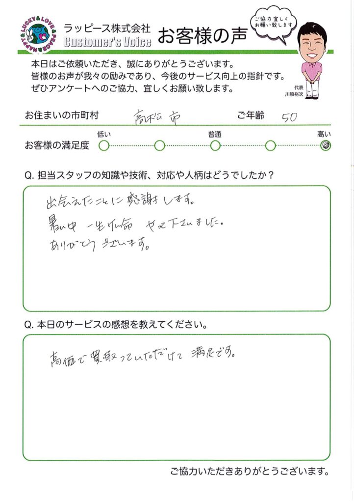 高松市 50歳|出会えたことに感謝します 2024 9/10 担当スタッフについて 出会えたことに感謝します。 暑い中一生懸命やって下さいました。ありがとうございます。 買取りについて 高価で買取っていただけて満足です。 買取り よかったらシェアしてね! URLをコピーしました! URLをコピーしました! 関連記事 高浜市 48歳|めちゃめちゃいい!すごくお得感があった 大分市 74歳|お客様の気持ちになってくれた 高浜市 77歳|息子の様に接してくれた 高浜市 51歳|色んな商品のご相談にのってくださり助かりました 高浜市 77歳|最高 がんばりや!! 高浜市 43歳|知識、対応共に素晴らしかったです 愛媛県愛南町(56歳) お客様目線で思った以上の金額を頂きました 熊本県宇城市(45歳) 対応が良く仕事も早く完璧